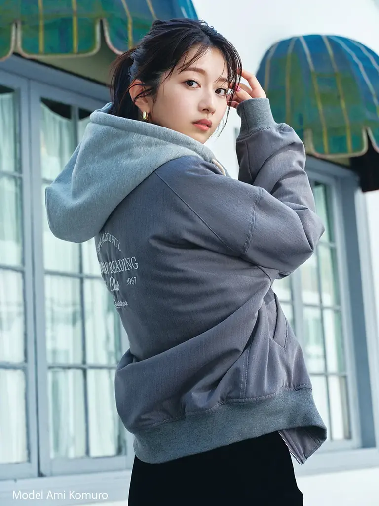 フーディーをブルゾンにレイヤードしたような見た目が特徴のフード付きMA-1。ゆったりとしたメンズライクなサイジングで、実用性と快適性を重視した作りになっている。