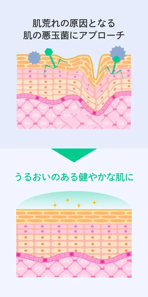 - 肌の悪玉菌にアプローチ:国産バクテリオファージが黄色ブドウ球菌に作用し、肌荒れ防止に寄与します。善玉菌に影響しにくい点が特徴です。