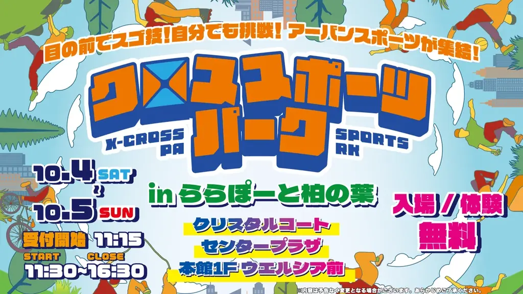 株式会社MoveXが主催する「クロススポーツパーク in ららぽーと柏の葉」は、2025年10月4日(土)・5日(日)の2日間、ららぽーと柏の葉(千葉県柏市)で開催される体験型アーバンスポーツイベントです。会場は施設内の「クリスタルコート」「センタープラザ」「本館1F ウエルシア前」の3か所に分かれており、来場者は会場をめぐりながら複数の種目を体験できます。