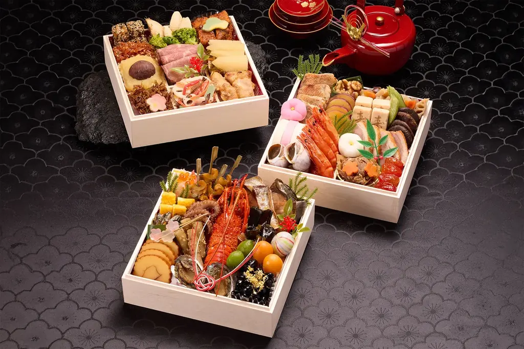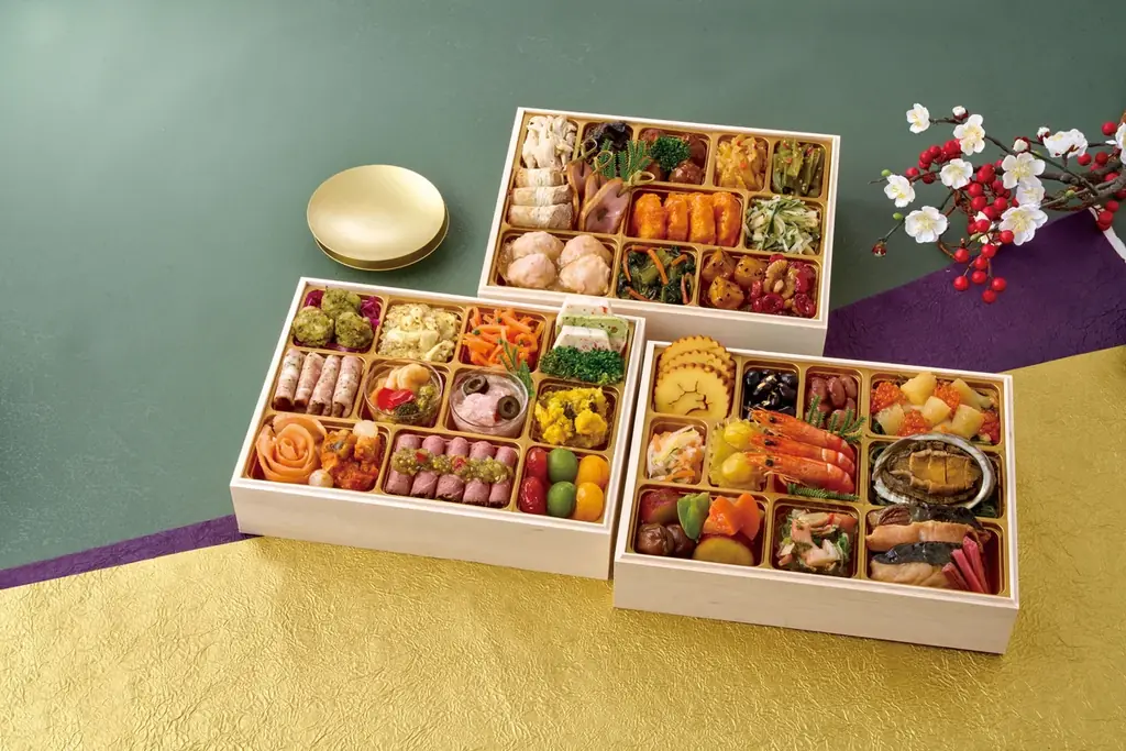一の重は祝い肴中心、二の重は焼魚や肉料理、三の重は洋風・中華風を詰め合わせる構成で、さらにすき焼き肉またはずわい蟹のいずれかを加えることで団らんのメインになることを想定しています。