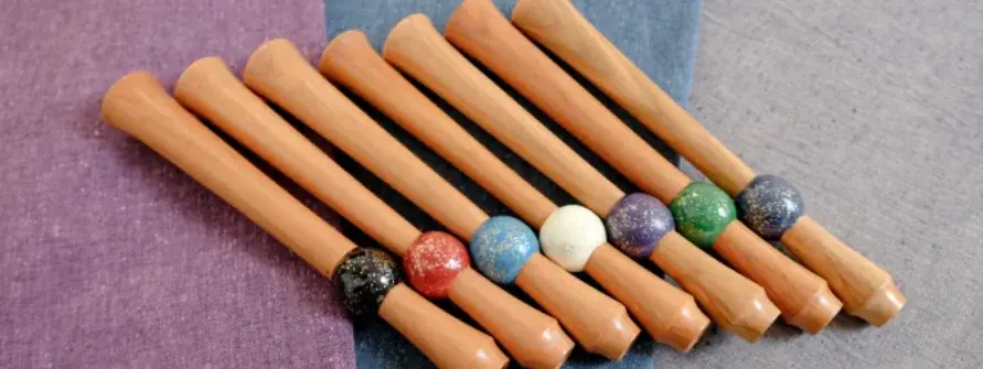 - 駿河蒔絵:漆で文様を描き金銀粉を蒔く装飾技法。挽物の手元に蒔絵を施すことで、上品な輝きを与える。