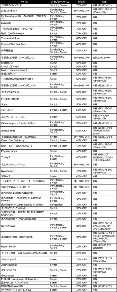 このセールはプラットフォームごとに開催期間が設定されており、一部タイトルでは開始日時が異なる場合があります。対象タイトルの詳細は公式サイトの作品一覧で確認可能です。セール開始日に関する正確な日時情報や購入可否は各ストア側の表記に従ってください。