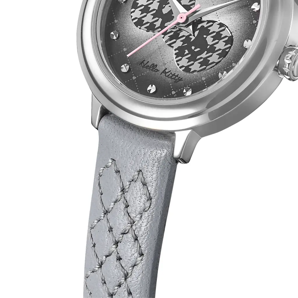 裏蓋にはハローキティの顔を刻印し、表側だけでなく裏側の仕上げにもこだわっています。ベルトはカーフレザーにキルティング加工を施し、繊細で高級感のある仕上がりです。日常使いに適した耐久性と上質感の両立を意図した構成です。