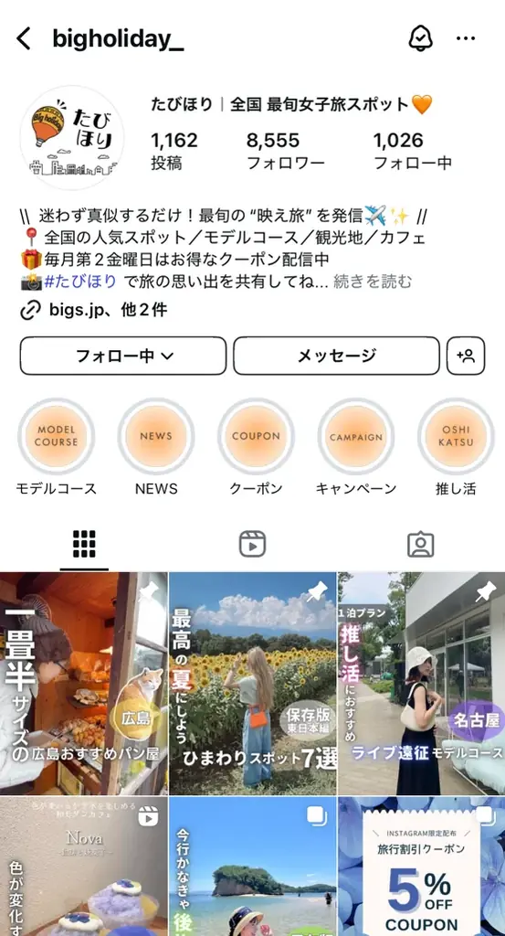 また、公式メディア「たびほり」は全国の最新女子旅スポットを紹介するWebメディアで、旅行プランに迷った際の参考にしやすい映えスポットや期間限定のツアー割引クーポンの配布などを行っています。公式のフォロー導線も用意されています。