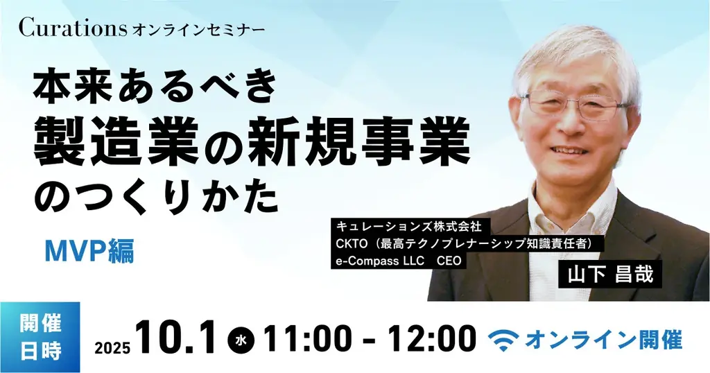 キュレーションズ株式会社は、2025年9月24日12時00分付のプレスリリースで、オンラインセミナー「本来あるべき製造業の新規事業のつくりかた~MVP編~」を2025年10月1日(水)11:00〜12:00に開催すると発表しました。担当は野崎氏で、本イベントはZoomによる無料配信です。