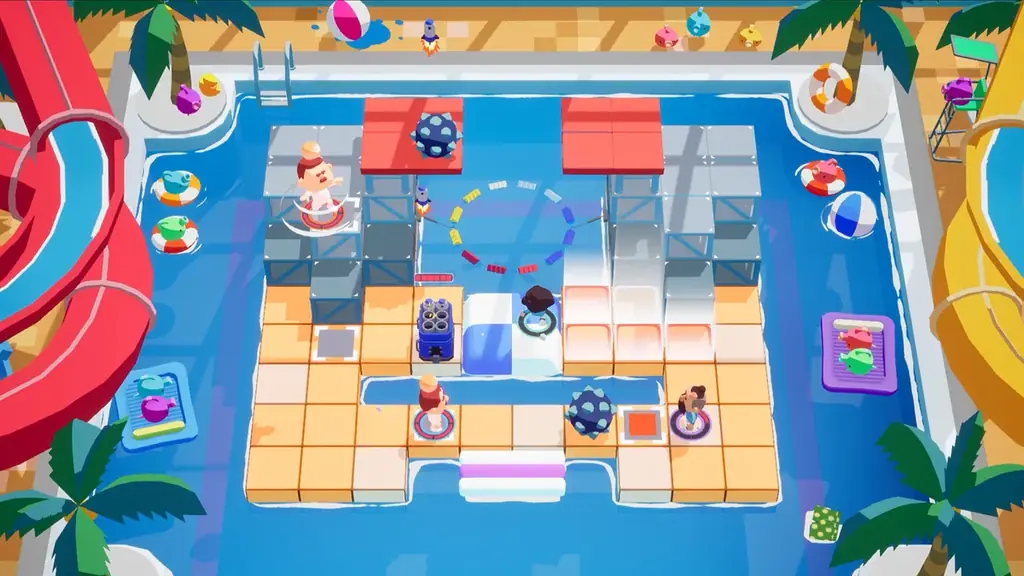 ステージごとに用意された個性豊かなギミックと、予測のつかない多数のアイテムがバトルを盛り上げます。開発側はこのタイトルを「混乱必至の『落とし合い』バトル」と表現しており、見た目にユニークなおじさんキャラクターたちが主役として登場します。