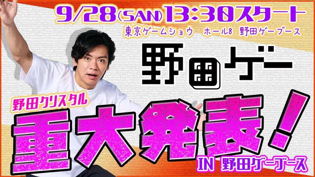 出展期間中の注目イベントのひとつとして、9月28日(日)13:30から14:15にかけて、吉本興業(野田ゲー)特設ブース(HALL8/08-N17)で野田クリスタル本人が登壇し、「野田ゲー」シリーズの新情報を発表するステージが予定されている。