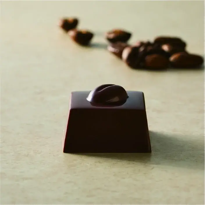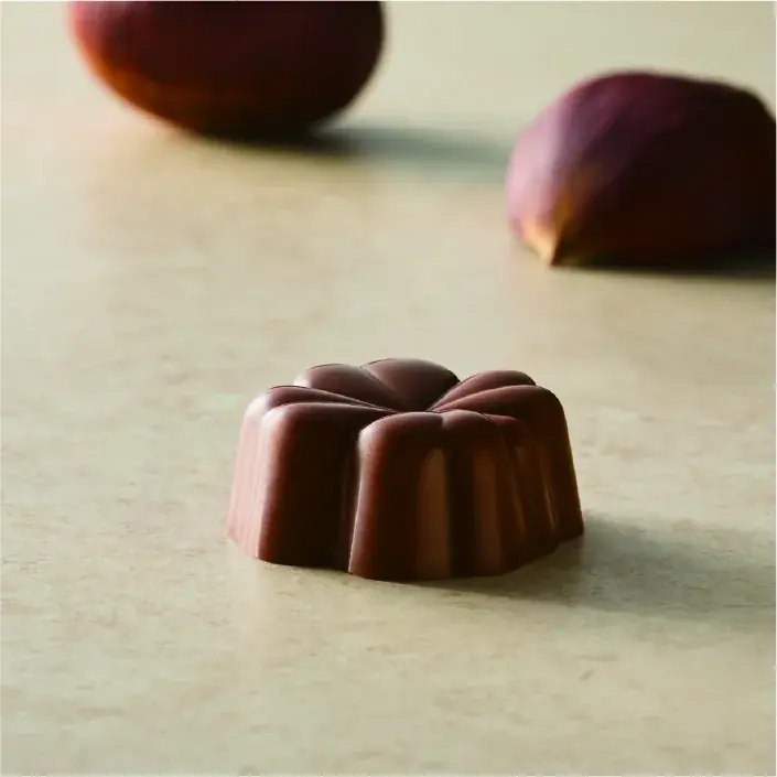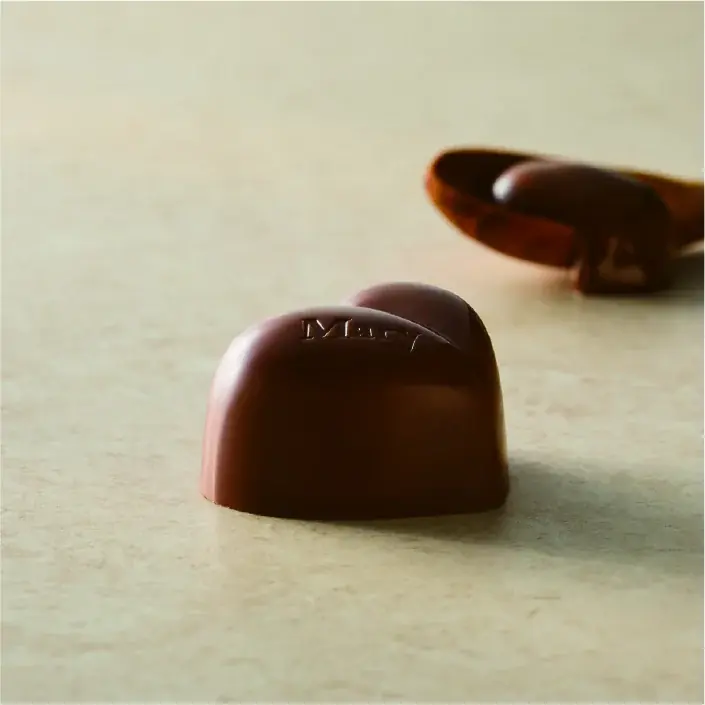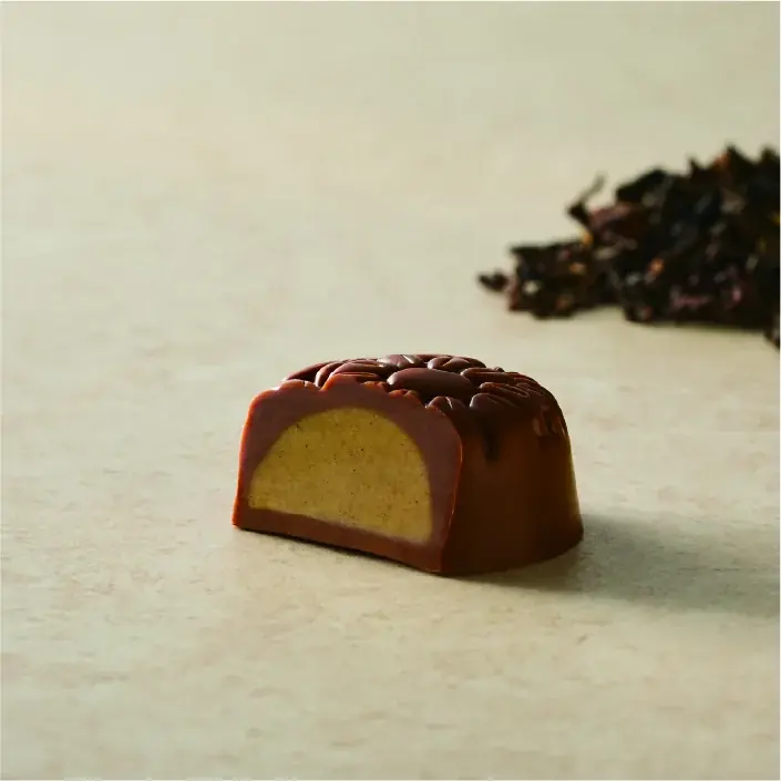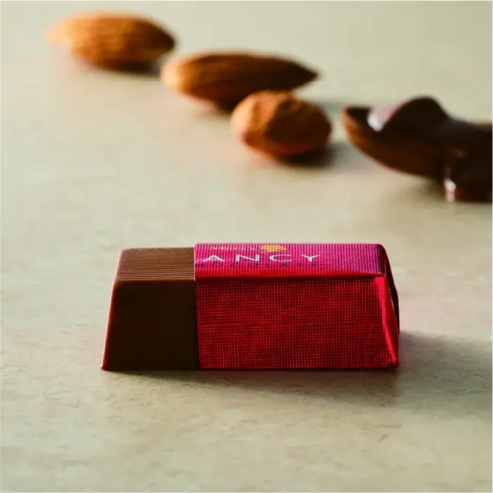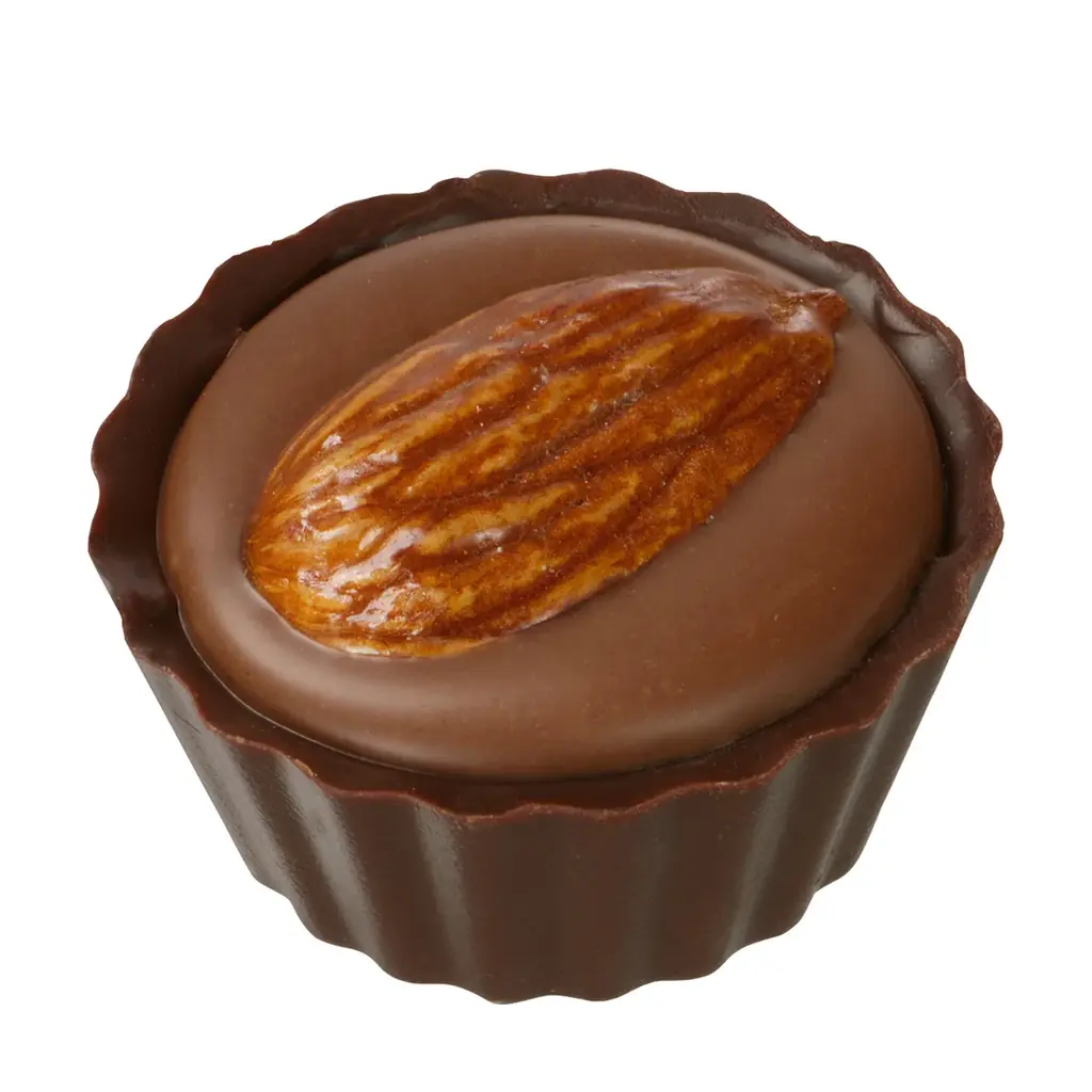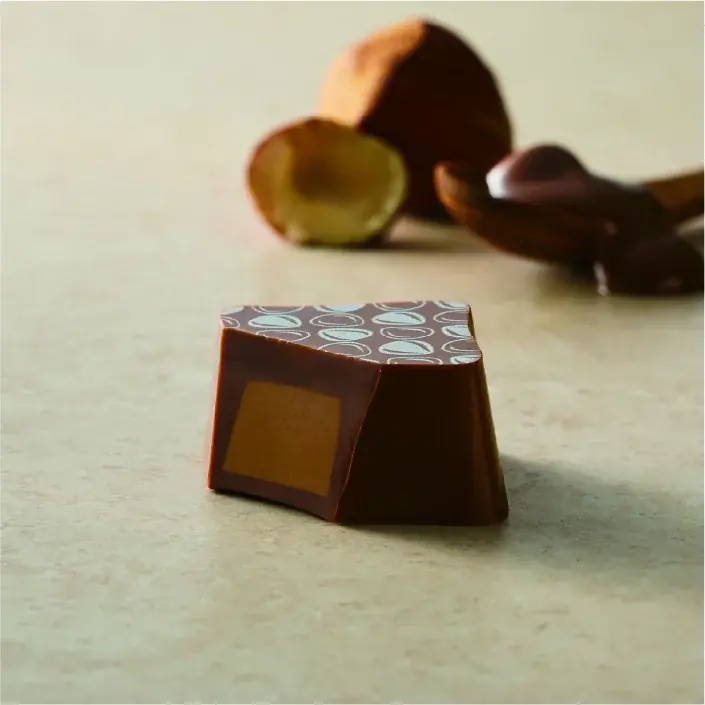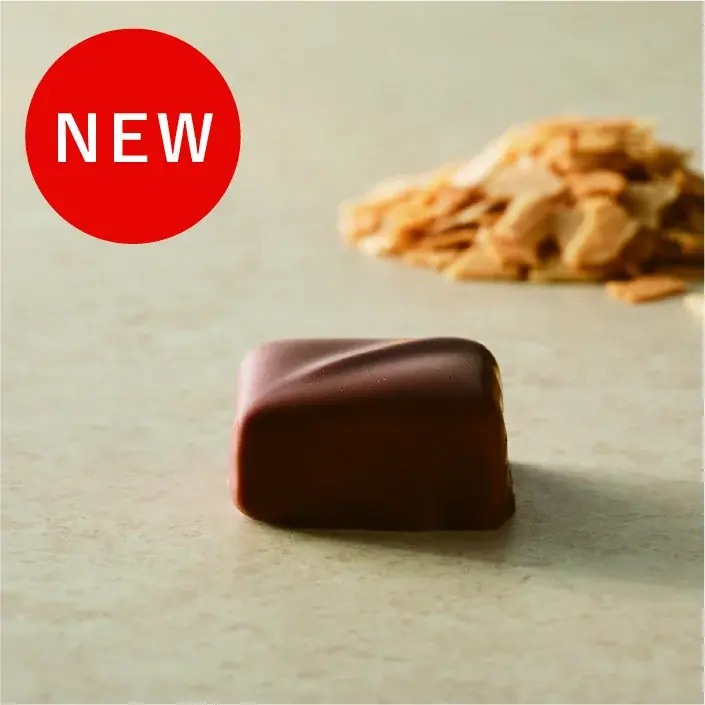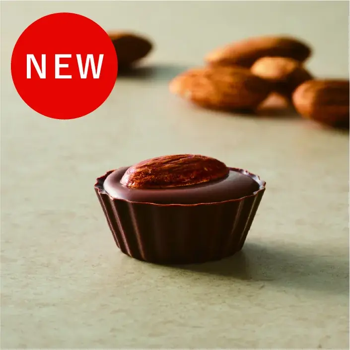 - アーモンドカップ:アーモンドジャンドゥヤに香ばしいアーモンドをのせた一粒。こだわりポイントは、カップ部分もチョコレートにして丸ごと食べられる構造。