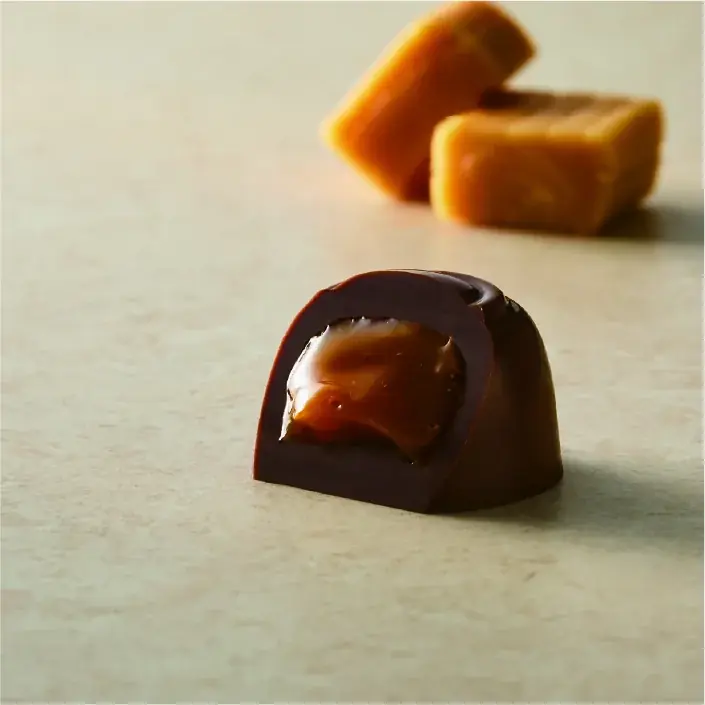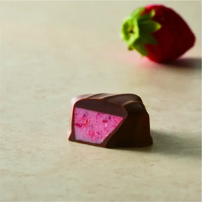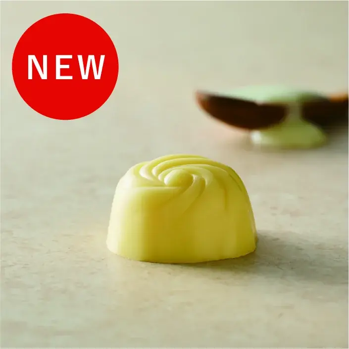- 練乳ホワイト:練乳のミルキーなコクと甘みを楽しめる一粒。こだわりポイントは、丸みや柔らかさで口どけのなめらかさを視覚的にも表現し、練乳パウダーと2種類のミルクフレーバーを配合している点。
