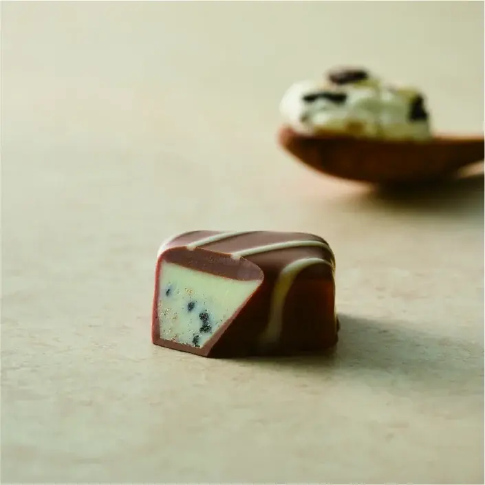 - ミルクフィアンティーヌ:砕いたクレープ生地(フィアンティーヌ)によるサクサク食感が特徴の一粒。こだわりポイントは、クレープ生地の風味を活かすためベースをシンプルなチョコレートにしてバランスをとった点。