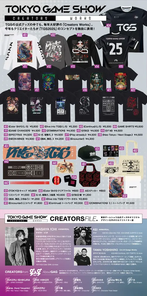 発表内容では、マサヤ・イチ自身が制作したアートパネル作品の展示・販売に加え、彼が運営するアートスクールGraphic Artist Guild(GAG)の在校生・講師作品を対象としたデザイン公募から選出された作品群を、マサヤ・イチがプロデュースする公式グッズブランド「TGS Creators Works」としてTシャツほか各種アイテムに展開し、会場で販売することが明示されています。