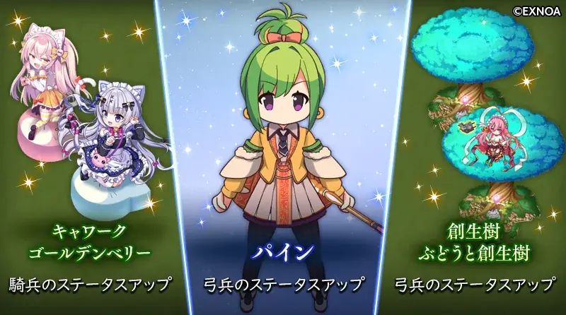 コラボ限定外観/施設 | 進軍スキン「パイン」、オーナメント「ゴールデンベリー」「キャワーク」、拠点スキン「創生樹」「ぶどうと創生樹」 |