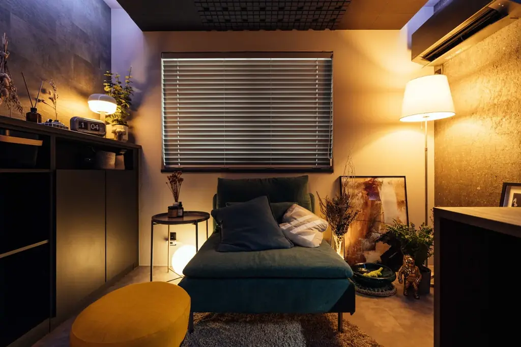 主な設備・特徴 | 据え置きデスク(ケーブル収納)、高密度遮音素材、見せる/隠す収納、間接照明(LEDテープライト)、質感重視の壁装材 |