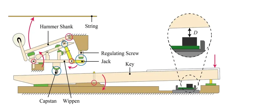 - 鍵盤がエスケープメント機構を通過する瞬間の加速度。音色の「重さ」「明瞭さ」に影響することが示唆された。