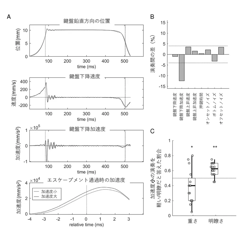 計測対象となったのは、国際的に著名な実績を有するピアニスト20名が行った、「明るい/暗い」「軽い/重い」といった意図的な音色表現を含む演奏です。各演奏の鍵盤動作と録音音をもとに、心理物理実験と統計解析を組み合わせて音色知覚の検証を行いました。