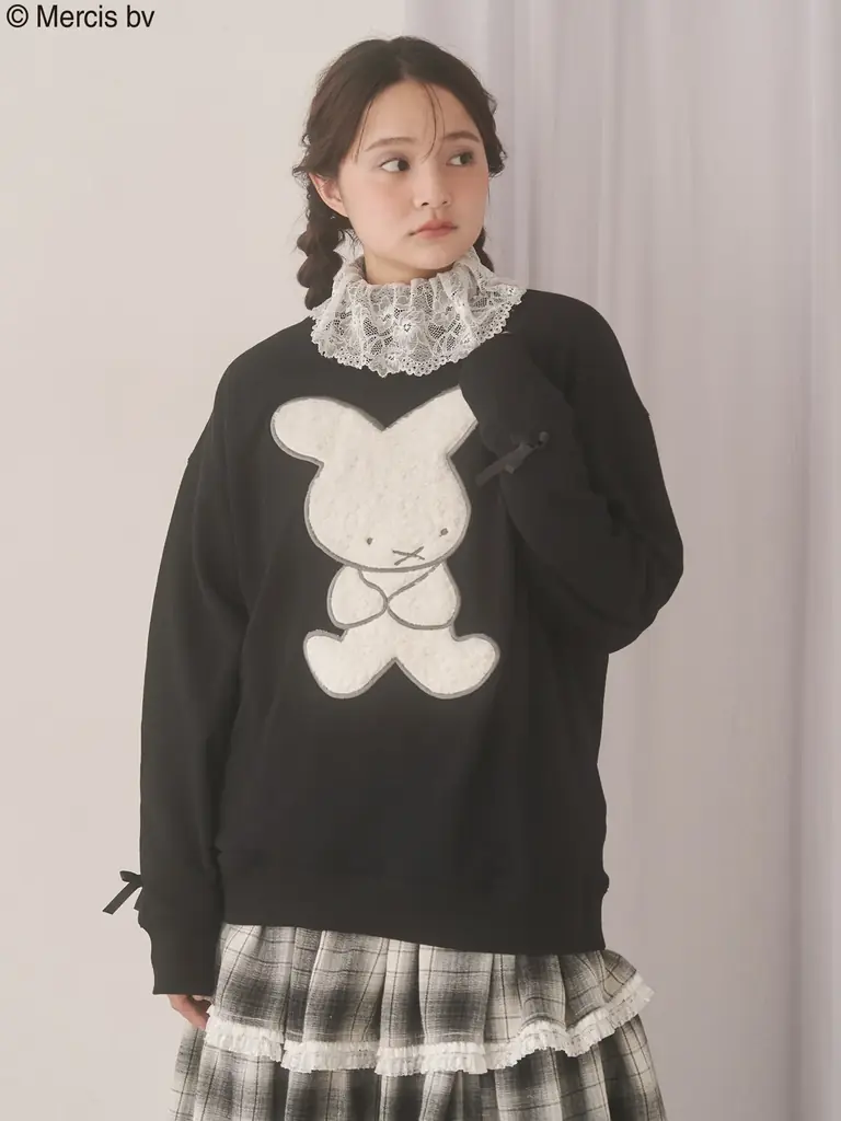 ナインチェのイラストを大きくあしらったスウェットトップスです。表面はふわふわのもこもこ素材で仕立てられており、肌触りの良さを重視した仕様になっています。シンプルなボトムスと合わせることで、トップス自体がコーディネートの主役になります。
