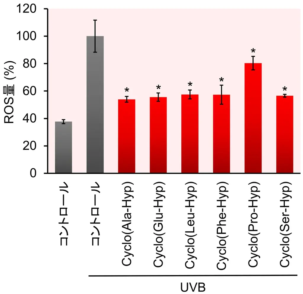 本研究ではヒト皮膚表皮細胞(epidermal keratinocytes)にUVBを照射して光老化モデルを作成し、各種cyclo(X-Hyp)を添加して評価を行いました。結果として、すべてのcyclo(X-Hyp)がUVB照射により増加した細胞内ROSを減少させることが確認され、強いROS消去能が示されました。統計解析ではDunnett’s testにおいて有意差が認められています(UVB照射コントロール=100%; *P < 0.01)。