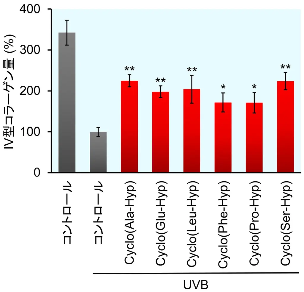UVB照射により低下した細胞内のIV型コラーゲン量に対して、cyclo(X-Hyp)を添加するとIV型コラーゲン量が回復しました。この結果は、光老化に伴う基底膜中のIV型コラーゲンの過度な分解を抑制する可能性を示しています。図の解析では有意差が示されており(Dunnett’s test, *P < 0.01 及び *P < 0.001)、生物学的意義が支持されています。
