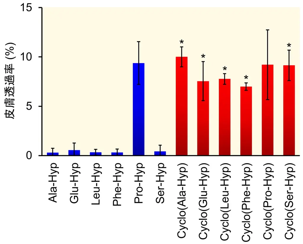 本研究ではヒト皮膚組織を用いた透過性試験も実施しています。その結果、cyclo(X-Hyp)は対応するX-Hypよりも効率的に皮膚を透過し、24時間後には塗布量の7~10%が透過していることが示されました。統計的にはStudent’s t-testで有意差が確認されています(*P < 0.01)。