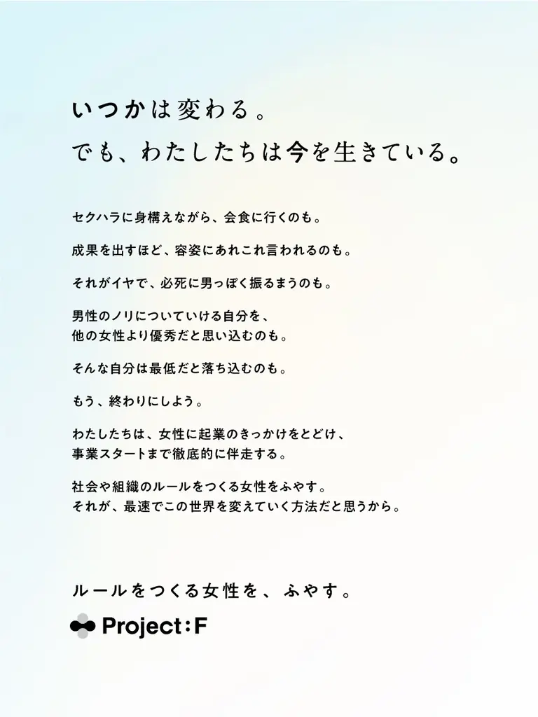 Sworkersが2024年12月に立ち上げた「Project:F(プロジェクトエフ)」は、女性起業家を増やし「ルールをつくる女性」を育てる一連の取り組みです。Project:Fは、女性が起案したルールやサービスが社会に広がることで、新たな雇用と次の起業の連鎖を生むことを目標としています。