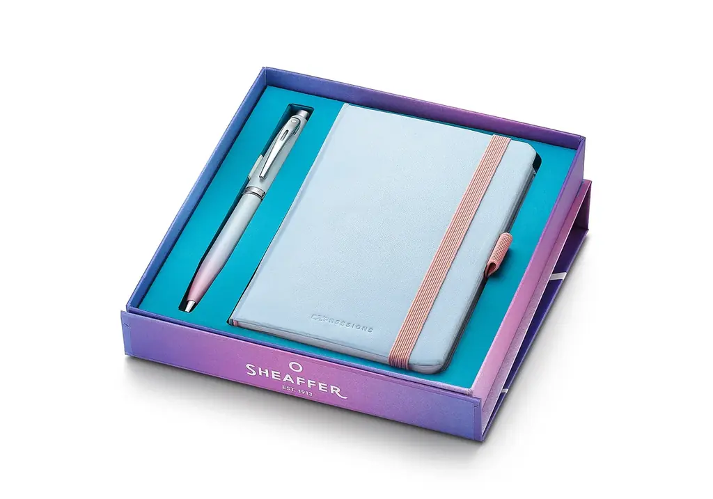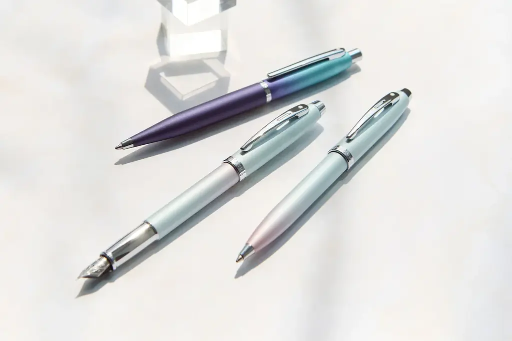 エクスプレッションズは3つのアイテム群で構成されます。Sheaffer 100シリーズをベースにしたパールグラデーションの万年筆とボールペン、VFM(Value For Money)ラインのブルーグラデーションボールペン、そして100シリーズのカラーと呼応するパステルカラーのミニノートが付属するギフトBOXです。