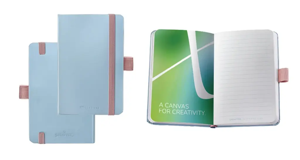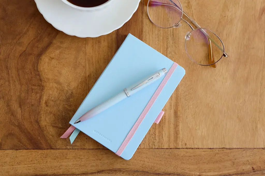 ギフトセットはコンパクトなノート(128ページ)を中心に構成され、100シリーズの筆記具カラーと呼応するピンクとライトブルーの2色のパステルカラーで統一されています。ノート用紙はFSC認証取得のインクフレンドリーな紙を採用し、筆記具との相性にも配慮しています。