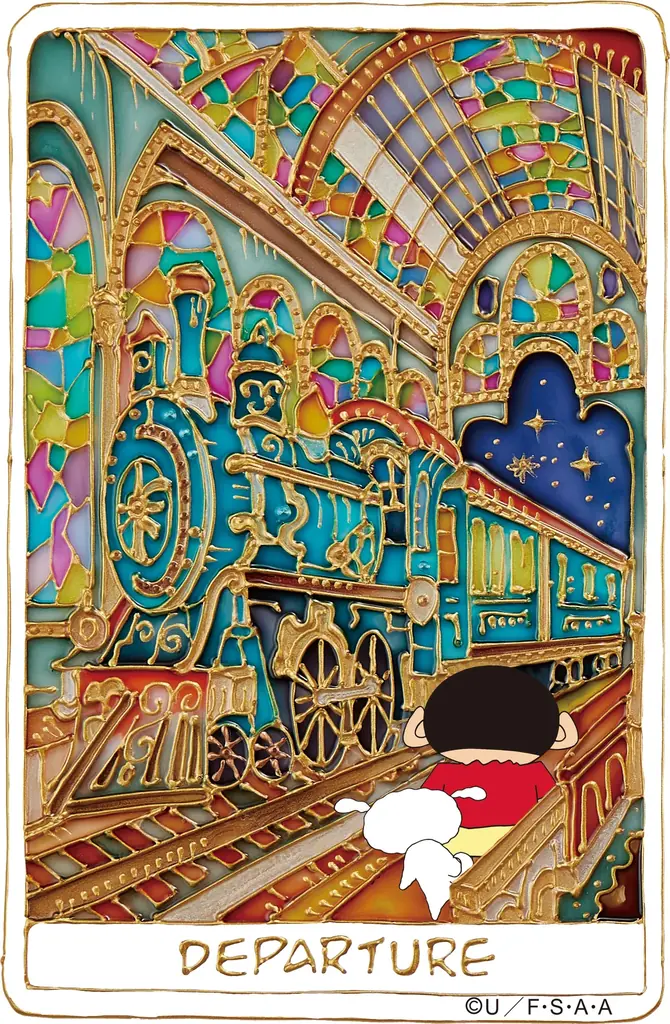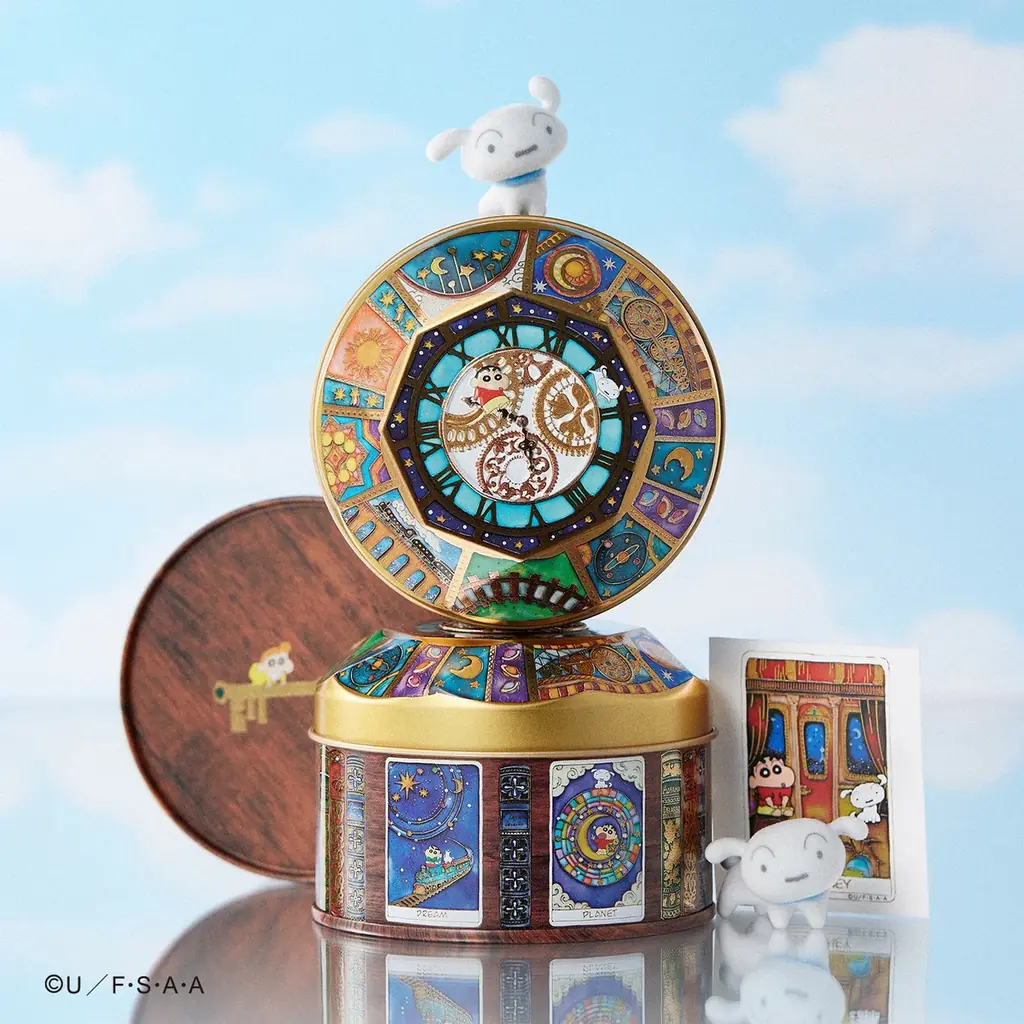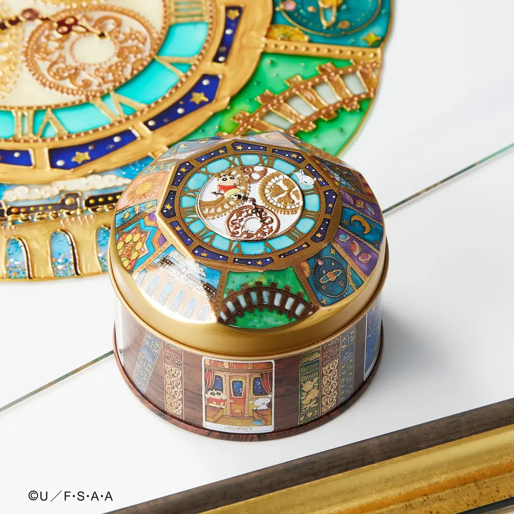 青山デカーボと『クレヨンしんちゃん』の初コラボレーション商品として登場する『クレヨンしんちゃんトレイン缶』は、「魔法の列車に乗って宇宙の旅」をテーマに、ガラス絵ならではの幻想的な世界観を缶全面で表現しています。蓋面にはアンティーク風の歯車時計が配され、中央にはミニチュアのしんちゃんとシロが遊ぶ様子が描かれています。