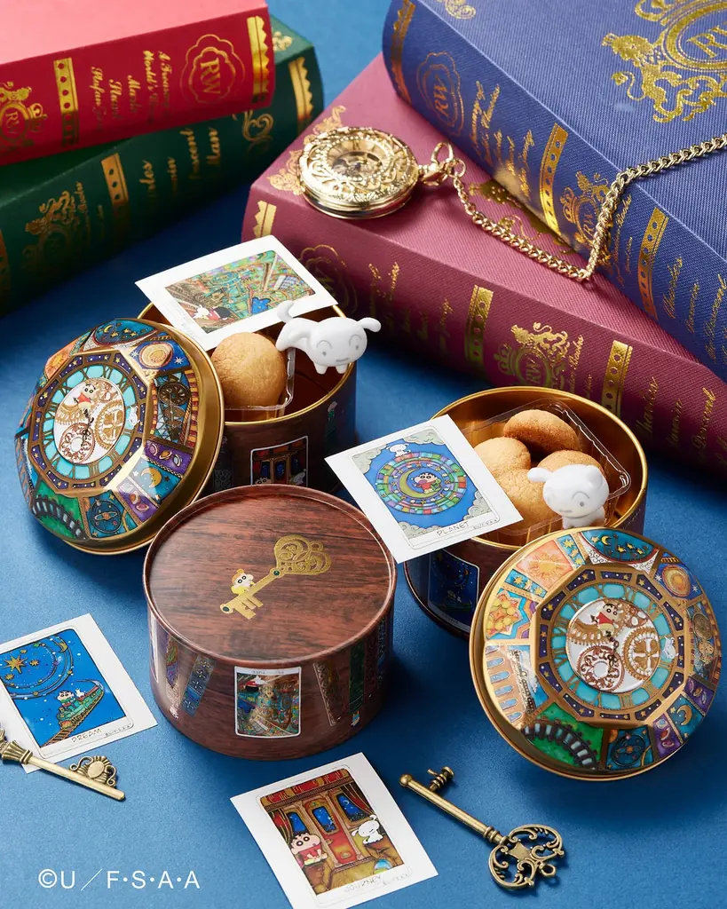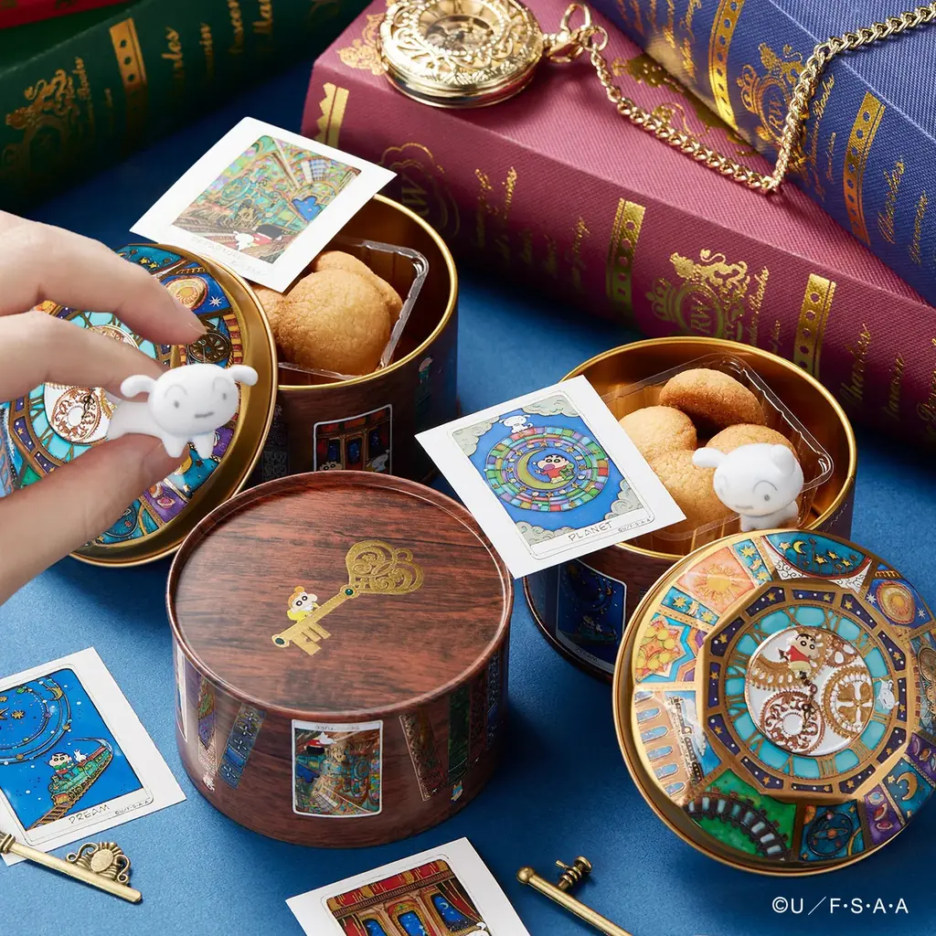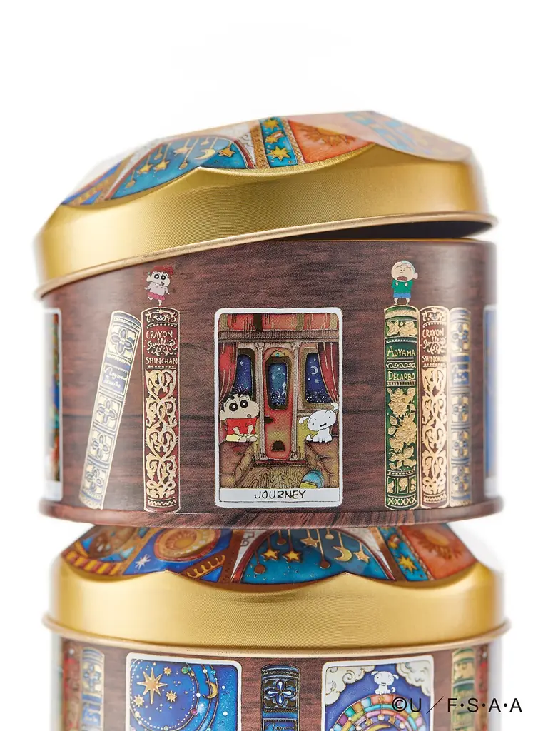 缶の側面には、しんちゃんとシロが魔法の列車に乗って旅をする様子が4枚のイラストで描かれ、それぞれに英語のタイトルが付いて物語性を補強しています。カードのように細部まで作り込まれているため、観賞用としての魅力も高いデザインです。