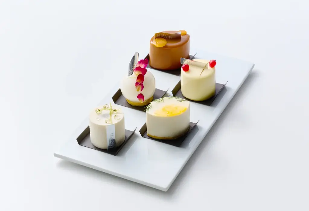 第四弾は、歴代シェフと現シェフの共演によるコラボパフェの提供です。UN GRAIN会員にて好評の「パルファン パルフェ」をベースに、初代・二代目の各シェフと三代目シェフ岡澤高志氏がそれぞれコラボレーションした特別なデセールを期間限定で提供します。手間をかけて重ねたパーツが層となることで、ミニャルディーズ同様の繊細な味わいをパフェ形式で体感できる構成です。