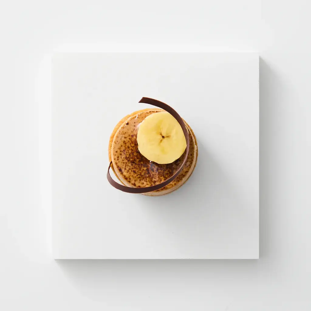 - キャラメリゼしたバナナとショコラのシブースト。考案者は金井史章シェフ。甘みと香ばしさが重なる組み立てが特徴。