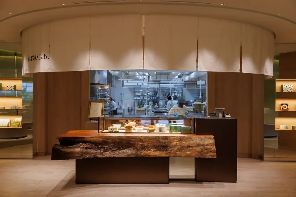 1階「京ばあむLab.」はメインショップとして、抹茶を使用したスイーツや和洋の生菓子をテイクアウトで販売しています。ガラスケース越しに広がる工房では、パティシエがスイーツを仕立てる様子を眺めることができます。