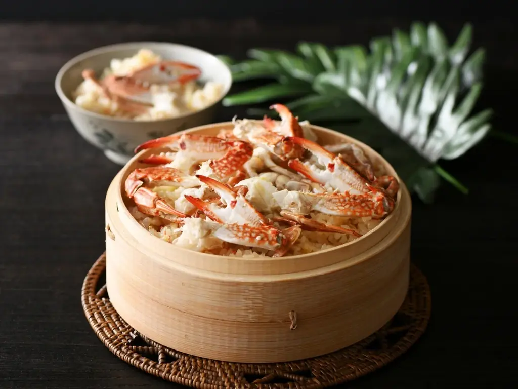 台湾風蟹おこわ:蟹の旨みがたっぷり染み込み、生姜の風味がアクセントとなる逸品。リリースでは「シズル感溢れる贅沢な味わい」と表現され、食欲を刺激する構成で提供される。