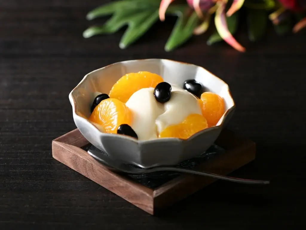 みかん豆花:滑らかな豆花(トウファ)にみかんの酸味と黒豆のもっちりした甘さが加わるスイーツ。見た目の可愛さと、豆の風味の優しさを両立したデザートとして紹介されている。