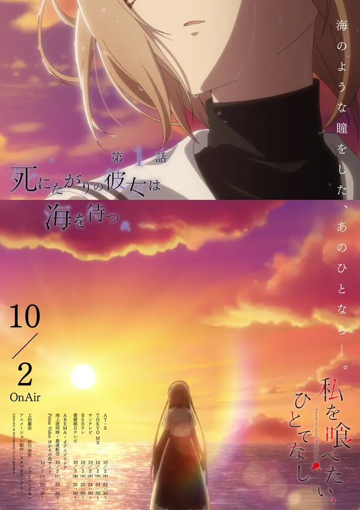 第1話のタイトルは『死にたがりの彼女は海を待つ』。あらすじでは、空虚な日々を過ごす八百歳比名子が、深い海のように透き通った瞳を持つ少女と出会う場面が描かれます。授業中もその少女を思い浮かべる比名子は、下校時に海の匂いを感じ、上履きのまま海へ向かうと人ならざる者が海の中から姿を表します。公開された予告映像では、比名子、汐莉、美胡の声とともに、無数の言葉が深い海の底から湧き上がる描写が神秘的な世界観を演出しています。