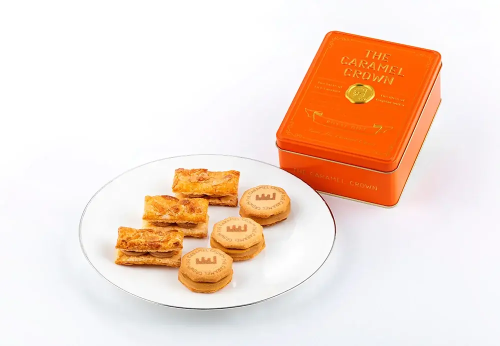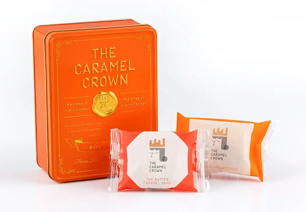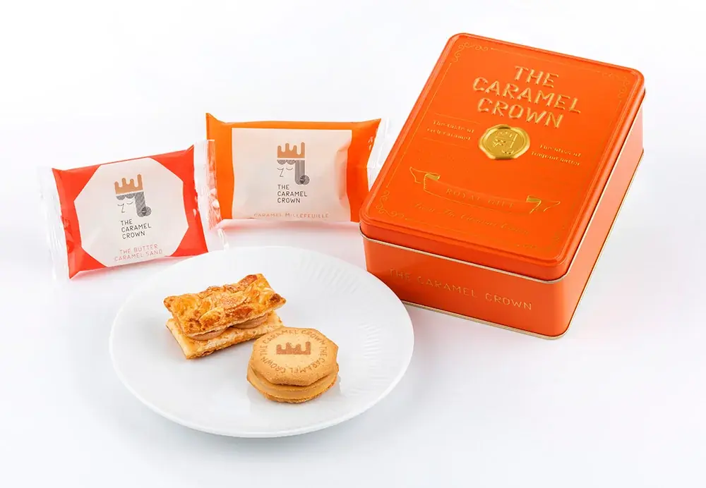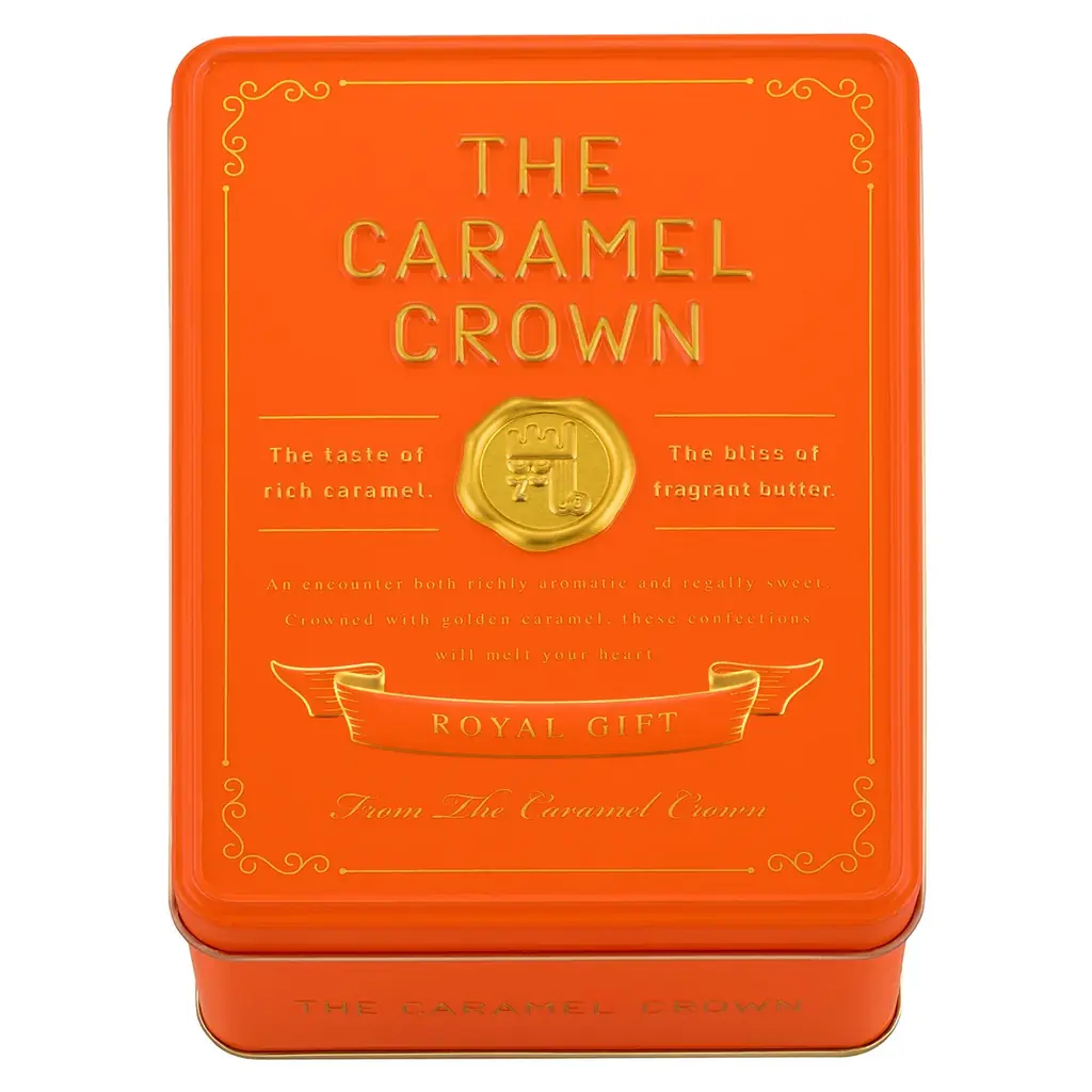 今回の容器は華やかなブランドカラーのオレンジ缶が採用され、デザインテーマは「キャラメル王室からの贈り物」。封蝋印をイメージしたゴールドのロゴマークが配され、エンボス加工による見た目と手触りの工夫が施されています。