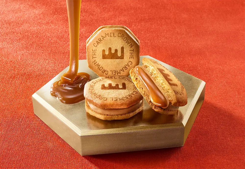 『THE バターキャラメルサンド』は、バターキャラメルの塊をそのままフォンダンで包むことで<できたての柔らかさ>を楽しめる点が最大の特徴です。サンドするのはさくさくのバターサブレで、食感のコントラストが設計されています。
