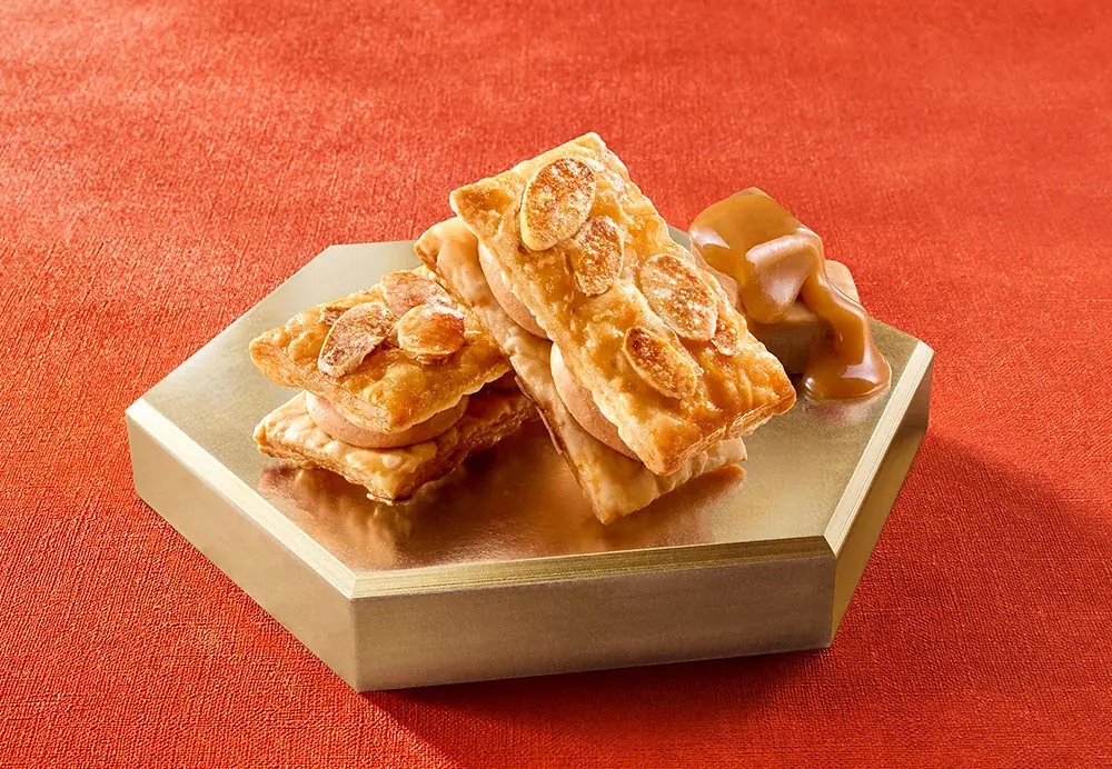 『キャラメルミルフィーユ』は、柔らかなバターキャラメルショコラクリームと108層のパイ生地を組み合わせ、アーモンドスライスをまぶしてフロランタン風に焼き上げた商品です。108層のパイ生地が生み出す軽やかなサクサク感と、キャラメルの優しい甘さが特徴です。