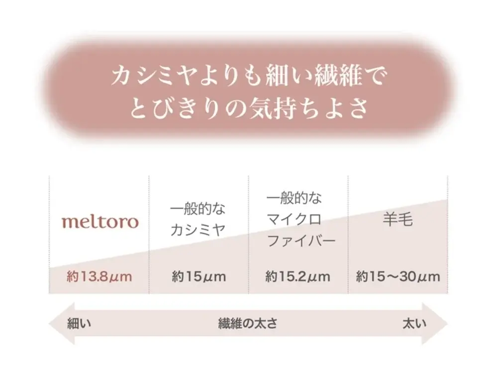 「meltoro(メルトロ)」は極細マイクロファイバーを用い、一般的なマイクロファイバーよりもボリュームを持たせた編み上げが特徴です。製造工程で繊維の1本1本を滑らかにする加工を多く行うことで、カシミヤに匹敵するような滑らかな肌触りとふんわりとした温かさを実現しています。