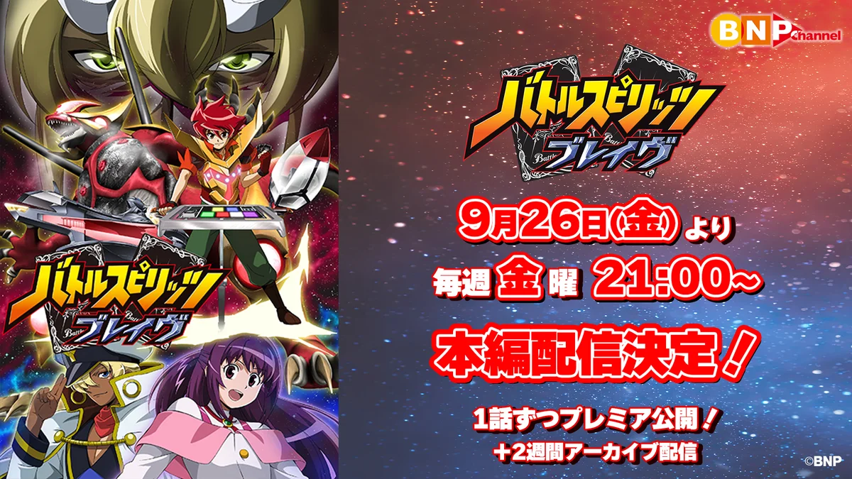 株式会社バンダイナムコピクチャーズは、テレビアニメ『バトルスピリッツ ブレイヴ』の全50話を期間限定で無料配信すると発表しました。配信は公式YouTubeチャンネル「【公式】BN Picturesチャンネル」で行われ、配信開始は2025年9月26日(金)21:00からです。