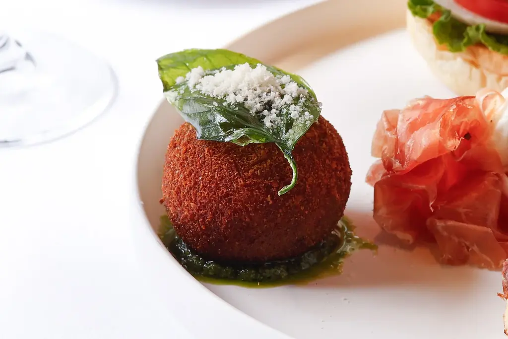 - ビーツのアランチーニ(ライスコロッケ) — ビーツの色と甘み、中心にとろけるチーズを閉じ込めたアランチーニ。ハーブソースで爽やかに。