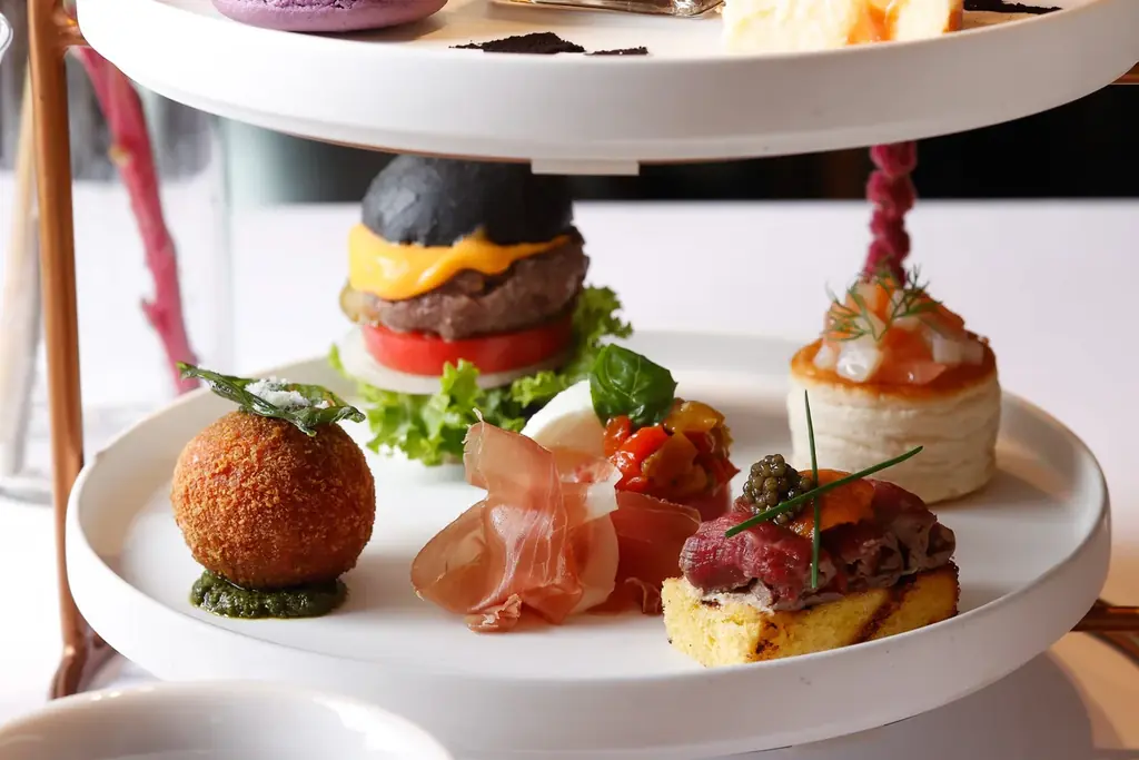 下段にはセイボリーが5種類並びます。USDAプライムビーフを用いたバーガーやオープンサンドなど、肉の旨味と海の幸を組み合わせた一皿が揃います。