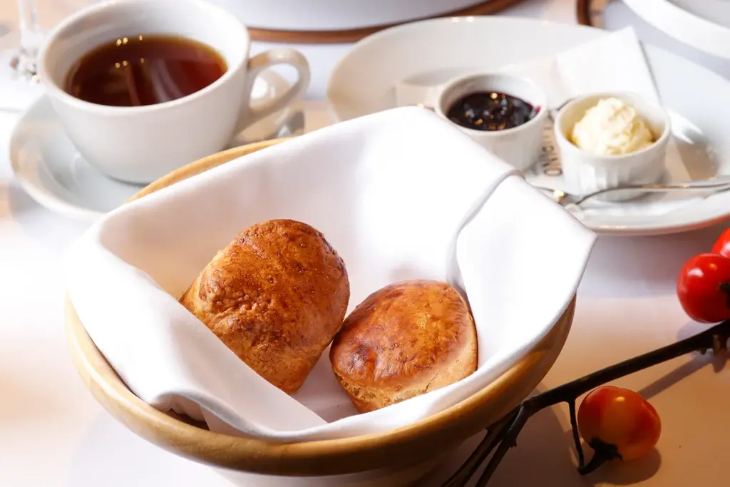 スコーンは自家製で、ブルーベリージャムとクロテッドクリームを添えて提供します。温かさとバターの風味がスイーツとセイボリー双方と調和する設えです。