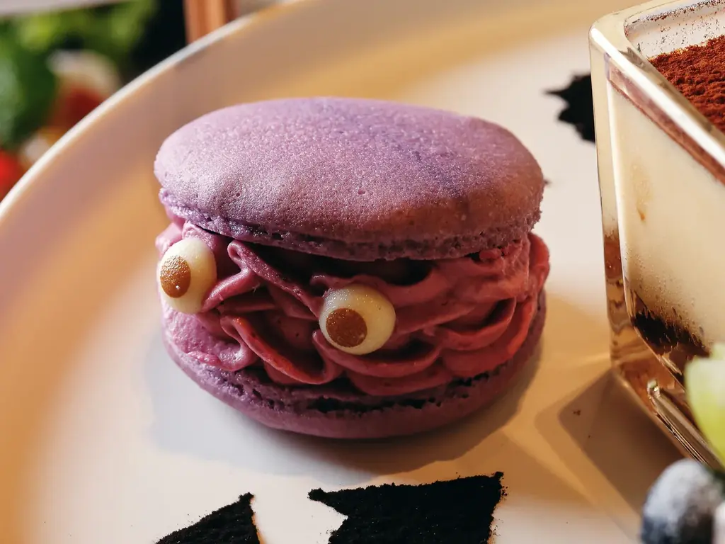 - カシスのマカロン — 鮮やかな紫色のマカロン。濃厚なカシスガナッシュとフルーティーなジャムを封じ込めています。