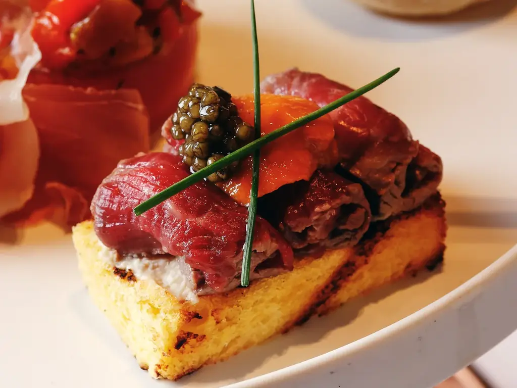 - USDA PRIME BEEFとウニ、キャビアのオープンサンド — 牛肉とウニ、キャビアを贅沢に組み合わせたオープンサンド。