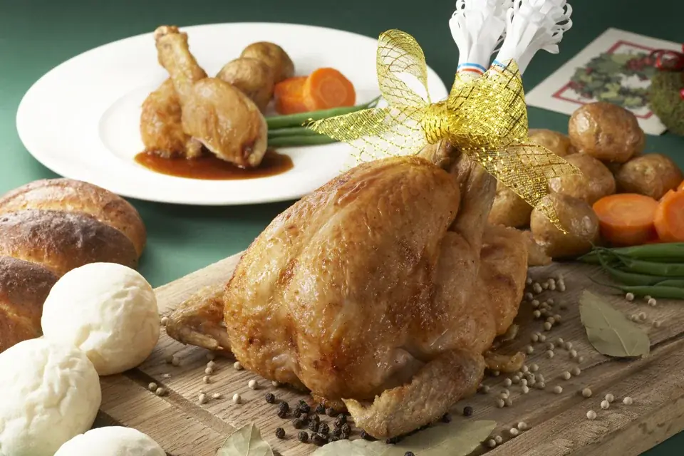 テーブルの主役となるローストチキンは2種類のパーティーセットとして用意されます。いずれもホテルの調理技術を活かした焼き上げで、家庭のクリスマスディナーを引き立てます。