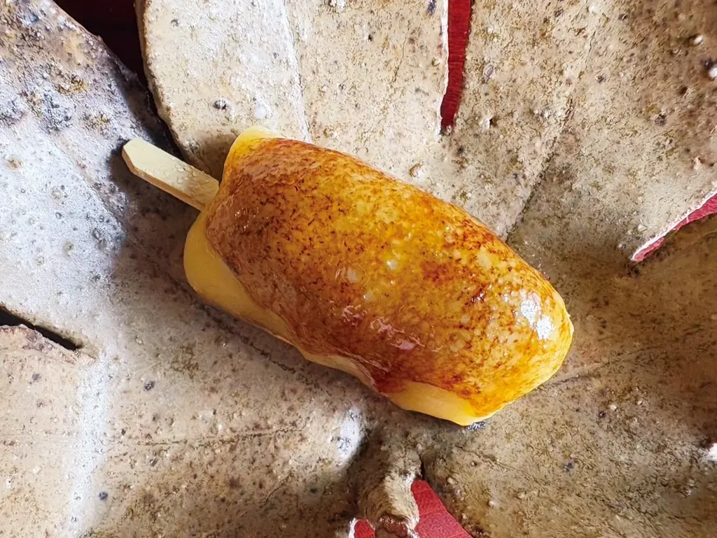 - 神奈川県『マゴベヱ団子 馬渡屋』 つぶあんブリュレ(1本)360円【小田急先行発売】。つぶあんの蕎麦団子にカスタードをまき、あぶりを入れた和洋折衷の品。