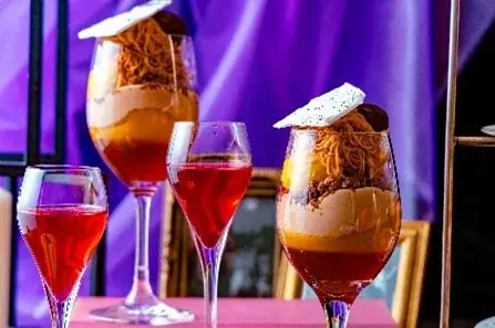 本アフタヌーンティーは三段ティースタンドのほか、各人に一つずつ提供されるモンブランパフェがセットになっています。パフェはワイングラスに盛り付けられ、下層にはアールグレイゼリーやアプリコット果肉、2種のアイスなどが入り、上層にはたっぷりのモンブランクリームと栗がのります。