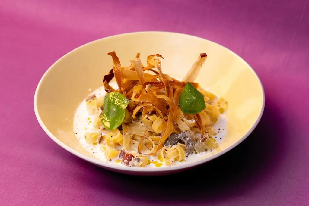 - 川越いもと奥秩父産まいたけのフェットチーネパスタ 1,280円(税込) — ソースに溶け込む川越いもの優しい甘さと、まいたけの芳醇な風味が重なり合う。濃厚な香りがありながらも軽やかな味わいのパスタ。