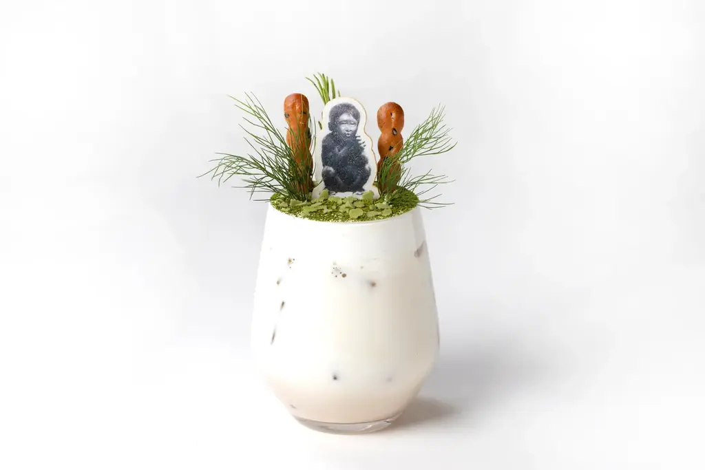 今回のためだけに特別に制作された子ゴリラの乗ったドリンク。ゴリラにちなんだ味わいで、見た目のフォルム(つぶらな瞳のモチーフ)にも注目。 - 浜田画伯のSラテ(通期):1,020円
