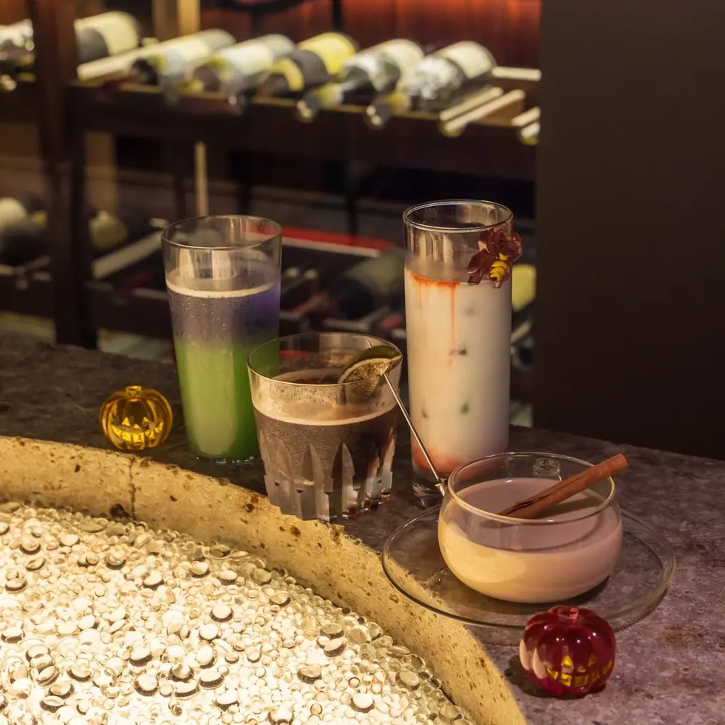 金乃竹 塔ノ澤ではバーテンダーがハロウィン限定のカクテルを4種類用意します。ネーミングや見た目にも工夫があり、例として「蜘蛛の食後」や「血窯」といったユニークな名称のカクテルがラインナップに含まれます。